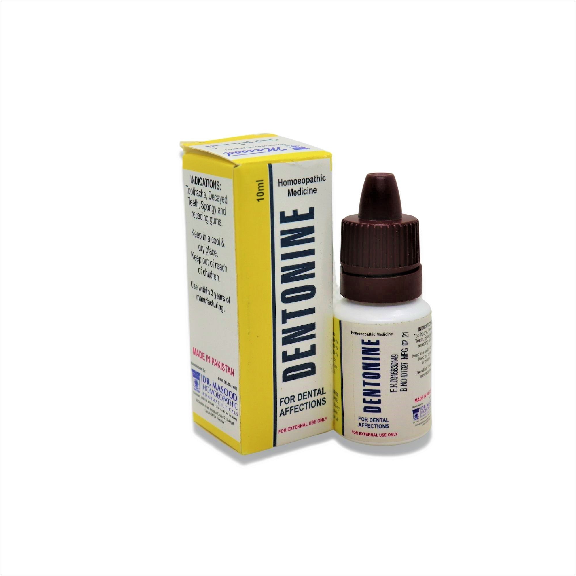 Masood's Dentonine is an effective solution for addressing dental and gum-related issues, such as toothaches, swollen gums, and cavities. It is used to treat conditions like gingivitis and loose sockets. Additionally, it provides relief for dental neuralgia, pyorrhea, and halitosis. It is also known to be effective in managing bleeding gums, toothaches, and tooth decay.