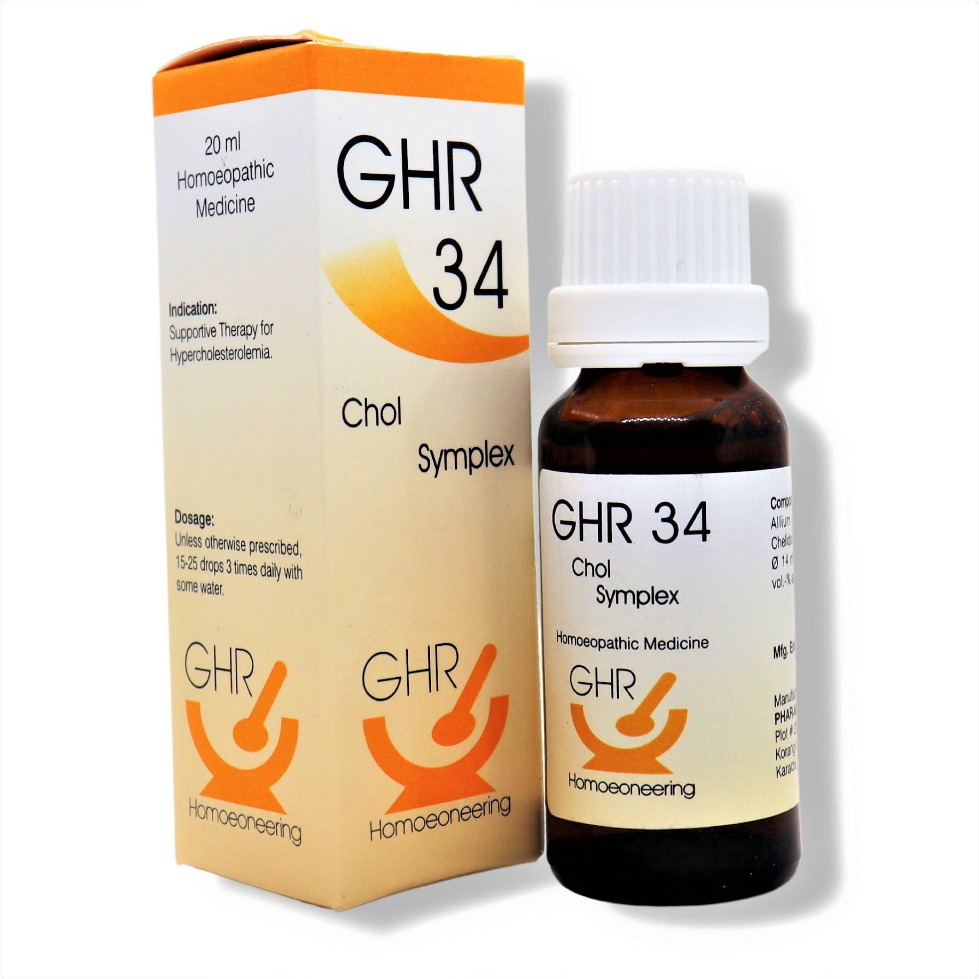 GHR 34, for controlling hypercholesterolemia caused by high levels of cholesterol in the blood. This metabolic derangement can be secondary to many diseases but is most notably associated with cardiovascular disease. GHR 34 helps normalize levels of lipoproteins in the bloodstream, so you can feel confident in managing cholesterol levels.
