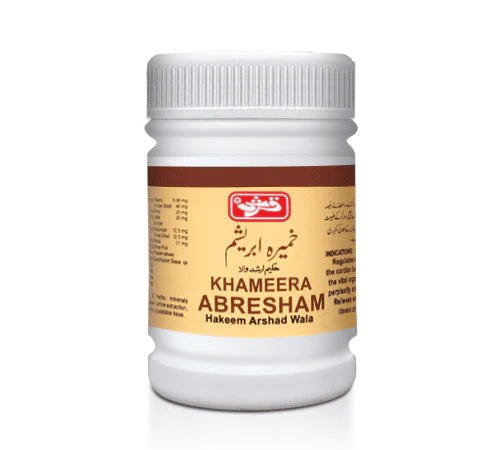 Khameera Abresham Hk. Arshad Wala is an herbal preparation that helps with regulating and normalizing cardiac beat patterns. It is specifically designed to potentiate vital parts, relieve restlessness and perplexity, and provide strength after illness or syncope. It is used as a tonic to improve the health of the heart, brain, and other vital organs.